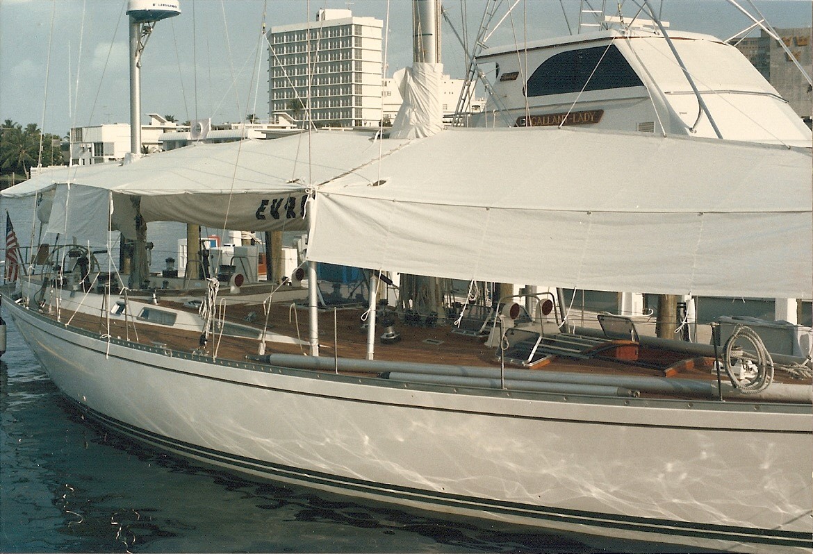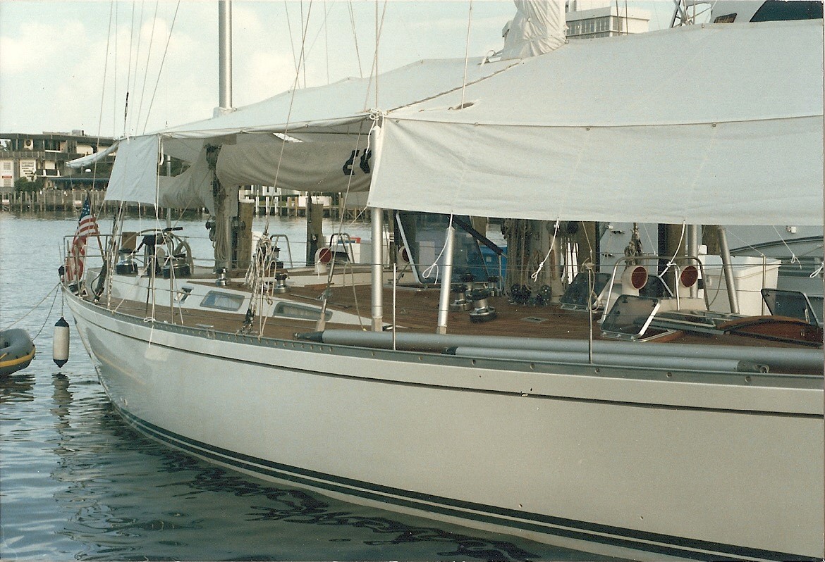 It's not hard to envision what a maniac I must have been every time I saw a single bird land on the spreaders of this boat. I am hoping the white Sunbrella wasn't my idea. I really like the look of them so it could have been me. Made In The Shade in Ft. Lauderdale built them along with the sail covers. The object was to save the teak decks from the intense south Florida sun and the polluted rain. The picture below shows 3 major maintenance points on that boat that kept a person busy. The topsides, the decks and the awnings. You're not going to just leave town for a few days with this setup.