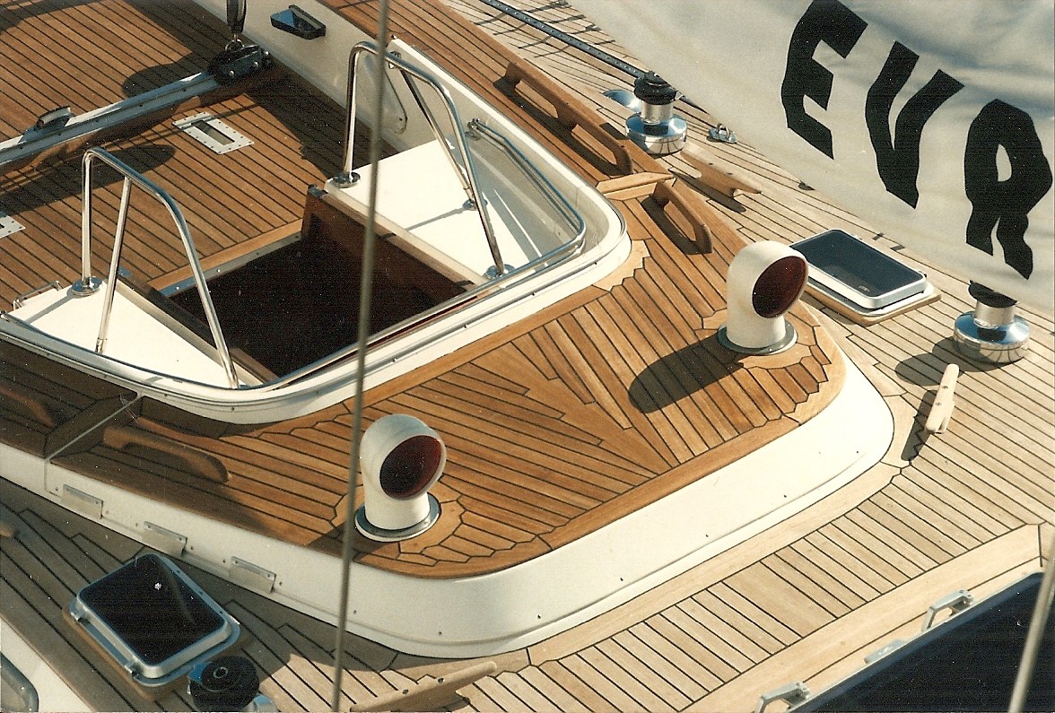 Next up are the teak decks. Sometimes I would refer to them as "my world". The best life for teak decks is to remain at sea. Every few days you splash them with salt water and gently brush them across the wood grain. They can last a long time in that environment. Eventually the softer grain gets washed away and makes little valleys if you could see a cross section through a microscope. Fresh water sits in those low spots and forms mold (or is it mildew) so the decks get darker and darker. The process of restoring them is labor intensive and harsh on everything (including the environment). It takes at least 3 people with one person whose duty is keeping everything wet at all times. There was a 3 part product sold by a guy that we all called Dr. King. He was a retired Dupont chemist and had a monopoly on deck treatments at that time. All the Feadship captains used him and then it trickled down to smaller boats with teak decks. Part A was a strong acid. It was lightly brushed on against the grain and made almost a mud during the application. The water person had to constantly rinse any anodized aluminum or other non-wood surfaces before the acid damaged their finish. Part 2 turned the decks a beautiful golden brown color and got rid of the mud. The third product was called Lestrain and it was a fine smelling thorough wash that got rid of any remaining chemicals. The harsh Part 1 would soften the mastic. Mastic is the rubbery black caulking between the narrow teak planks that allows the wood to shrink and swell. Of course more punky grain would get scrubbed away and sometimes a light sanding with a belt sander was needed to get things flush again. Unfortunately sanding would thin out the bungs. Bungs are the wood plugs that cover up the deck fasteners. You could tell they were thin because they were the last wood to dry after wetting the decks. Now you have to pry out the bung, back out the screw, drill out a little wood under the fastener to make a deeper seat, screw the fastener back in, glue in a new bung, chisel the bung flush with the deck and then you could move on to the next one. You can see how important it is to protect the decks and space out this process. When I knew I wasn't scheduled to move the boat I would oil them and dry them with the absorber almost every time they were wet. Salt water splotches on oiled decks so plain decks for passagemaking and oiled decks to protect them in port. That is what I got paid to do. A glamorous job for sure. This picture was my attempt to leave the high usage areas oiled and the rest stayed raw. This picture was a few days after a passage from Antibes to Athens. Not the best they can look but overall decent.